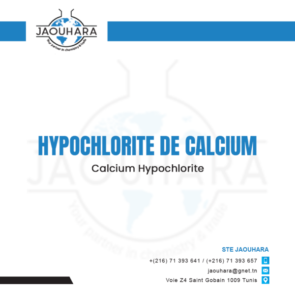 AccueilTraitement des eauxComposants chimiquesHYPOCHLORITE DE CALCIUM HYPOCHLORITE DE CALCIUM Solide blanc avec une forte odeur de chlore . Conditionnement Choisir une optionSac de 25KGEffacer quantité de HYPOCHLORITE DE CALCIUM Ajouter au panier UGS : ND Catégories : Composants chimiques, Traitement des eaux Identifiant du produit :21469 Description Informations complémentaires Description Largement utilisé comme désinfectant et agent de blanchiment pour le traitement de l’eau, les piscines et la lessive. Informations complémentaires Conditionnement Sac de 25KG Produits similaires HYPOPHOSPHITE DE SOUDE Ajouter au panier CITRATE TRISODIQUE DIHYDRATE Ajouter au panier SULFATE D’ALUMINE Ajouter au panier